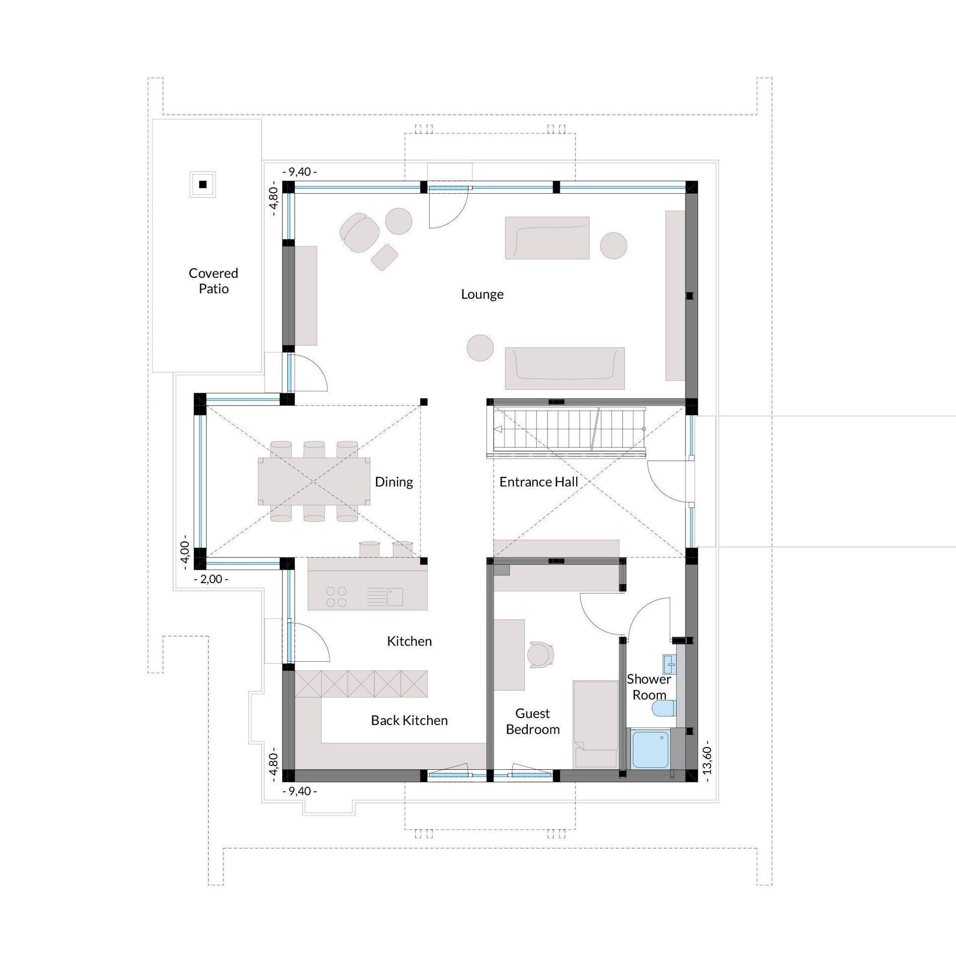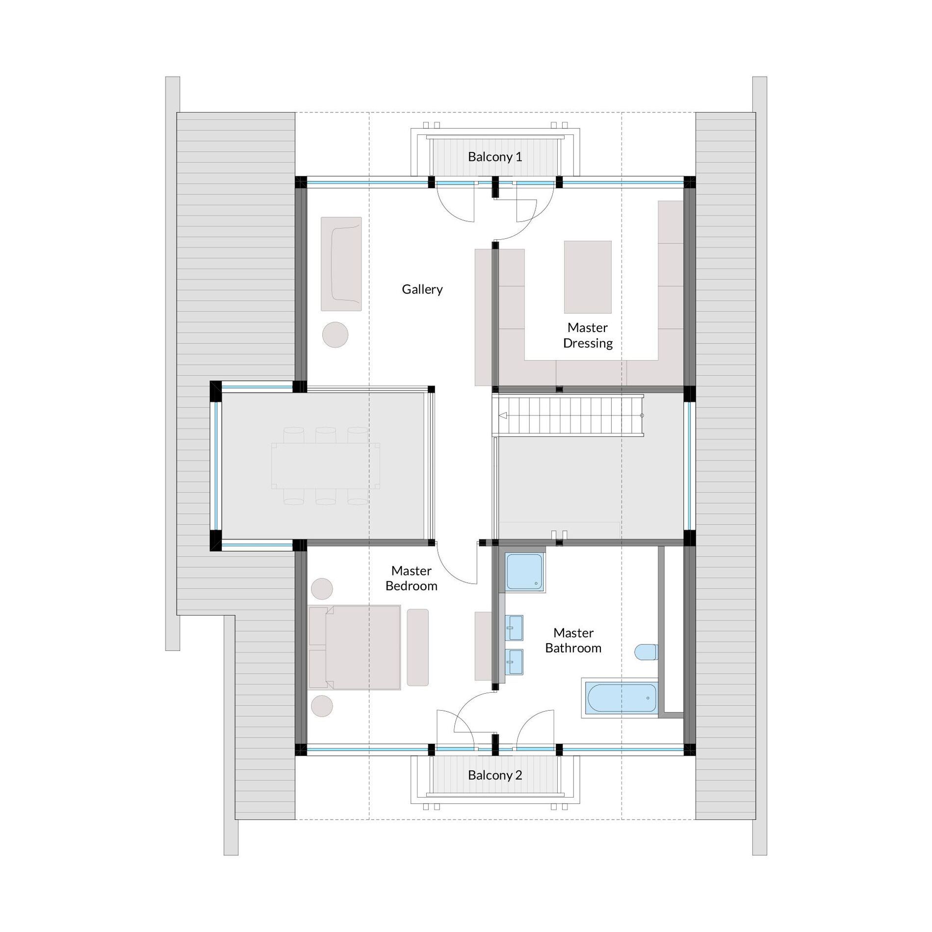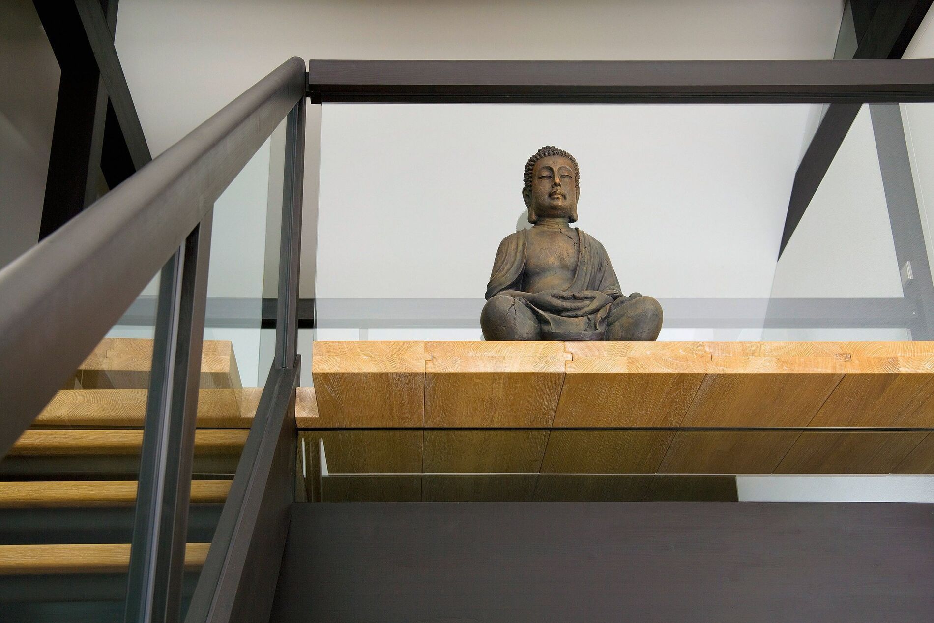 The south wing of the first floor offers generous space for a library and an expansive dressing room; the master bedroom and wellness bathroom are located in the north wing. The ground floor is a harmonious combination of kitchen, dining and living space.
