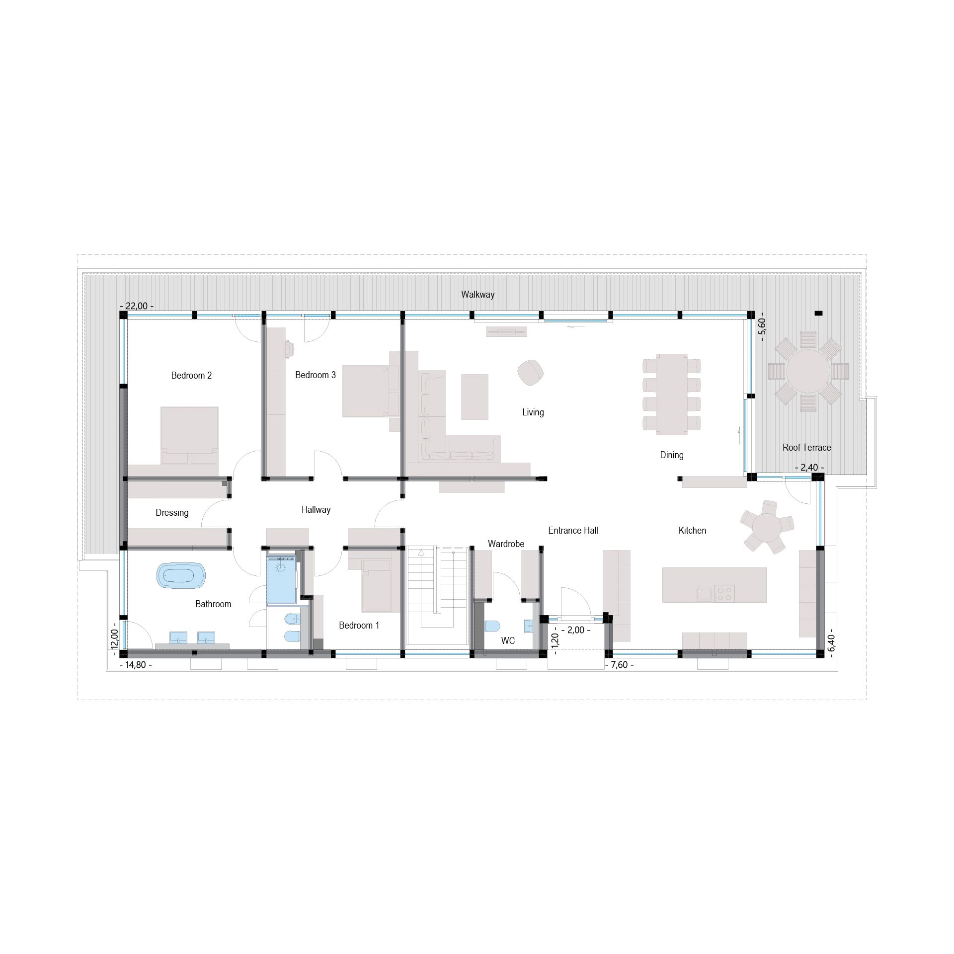 The guest room in the basement is certainly one of the special attractions: not only does it have access to the garden, but it also has its own shower room with adjoining dressing room. This allows guests to enjoy complete privacy – and the area can be used almost independently, for example for an au pair. When the daughter has grown up, she can create her own complete realm here. And thanks to the well-thought-out floor plan, the owners will always remain flexible. Even in old age they can continue to live comfortably on the first floor while a live-in caregiver can stay in the basement. Barrier-free access, for example, has already been considered: the front door is around 10 cm wider than standard and therefore wheelchair-accessible. The integrated KNX system, which can be used to conveniently control and regulate the home and heating technology, provides even more security and convenience.