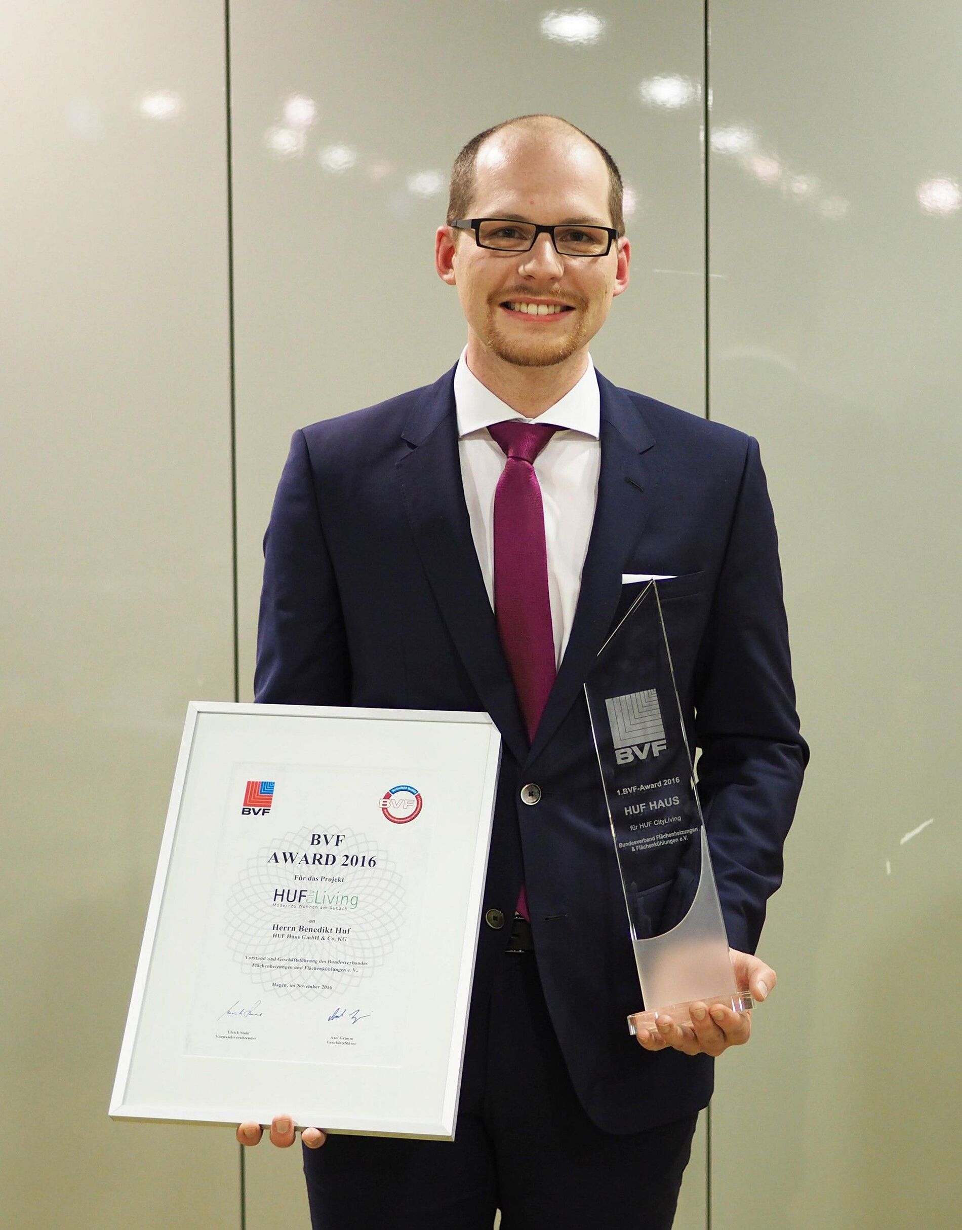 The Federal Association for Surface Heating and Cooling e. V. (BVF) awarded the prize for the exemplary residential project on 24 November 2016 in Berlin. HUF City Living - planned and realised by the Westerwald family business HUF HAUS - with the BVF Award 2016 for groundbreaking surface heating and cooling systems.