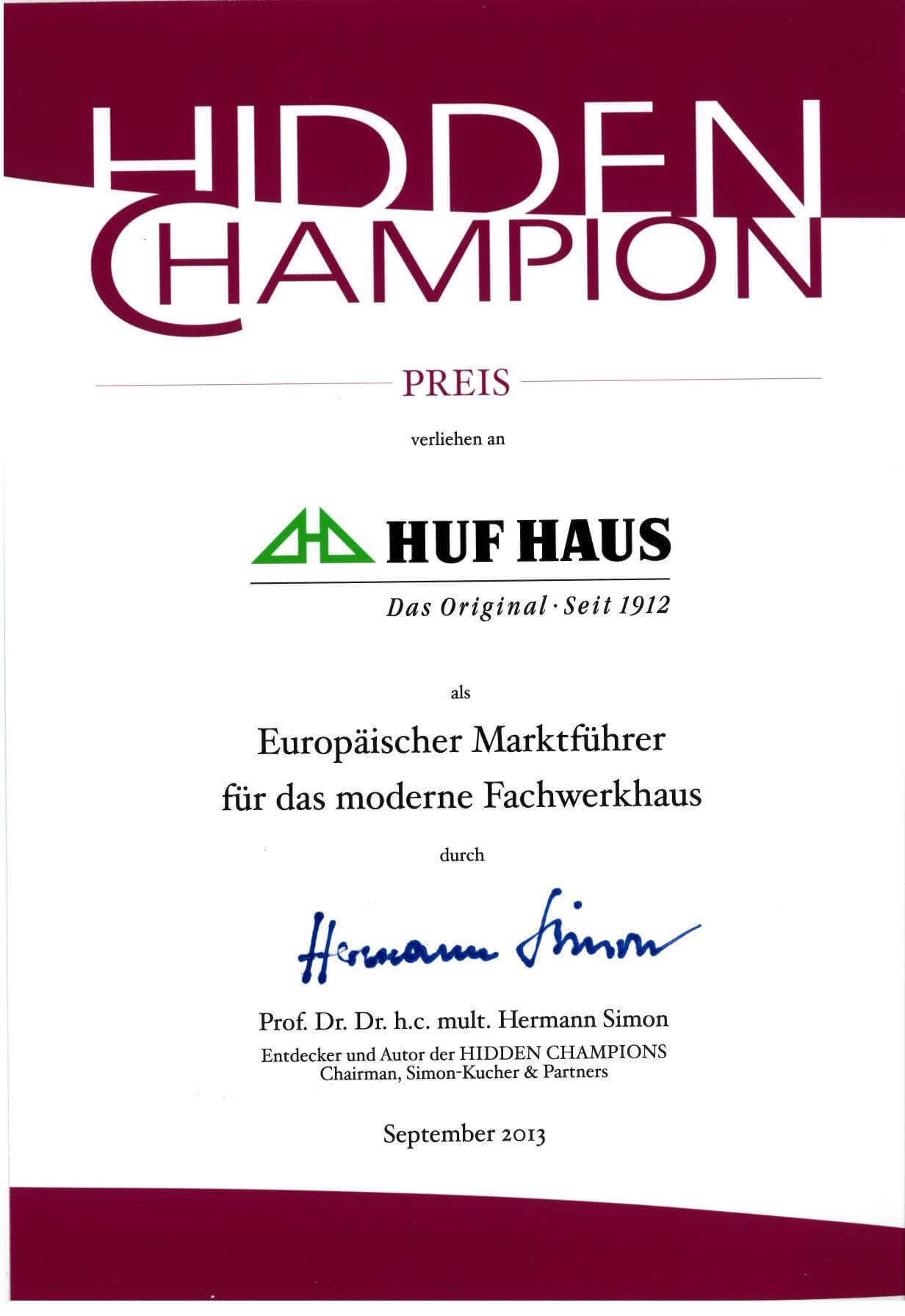 In September 2013 HUF HAUS received the "Hidden Champion" award from Prof. Dr. Dr. h.c. mult. Simon received. The certificate calls the family business the "European market leader for the modern half-timbered house".