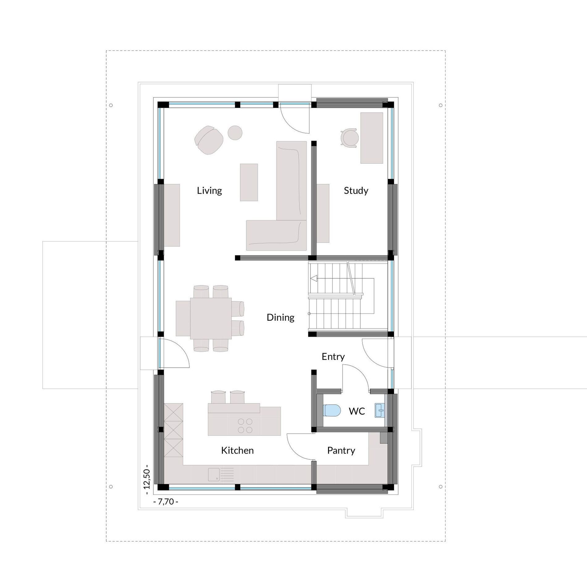One of the house’s most striking characteristics is the light axis that leads from the front door towards the garden – an ingenious architectural feature.