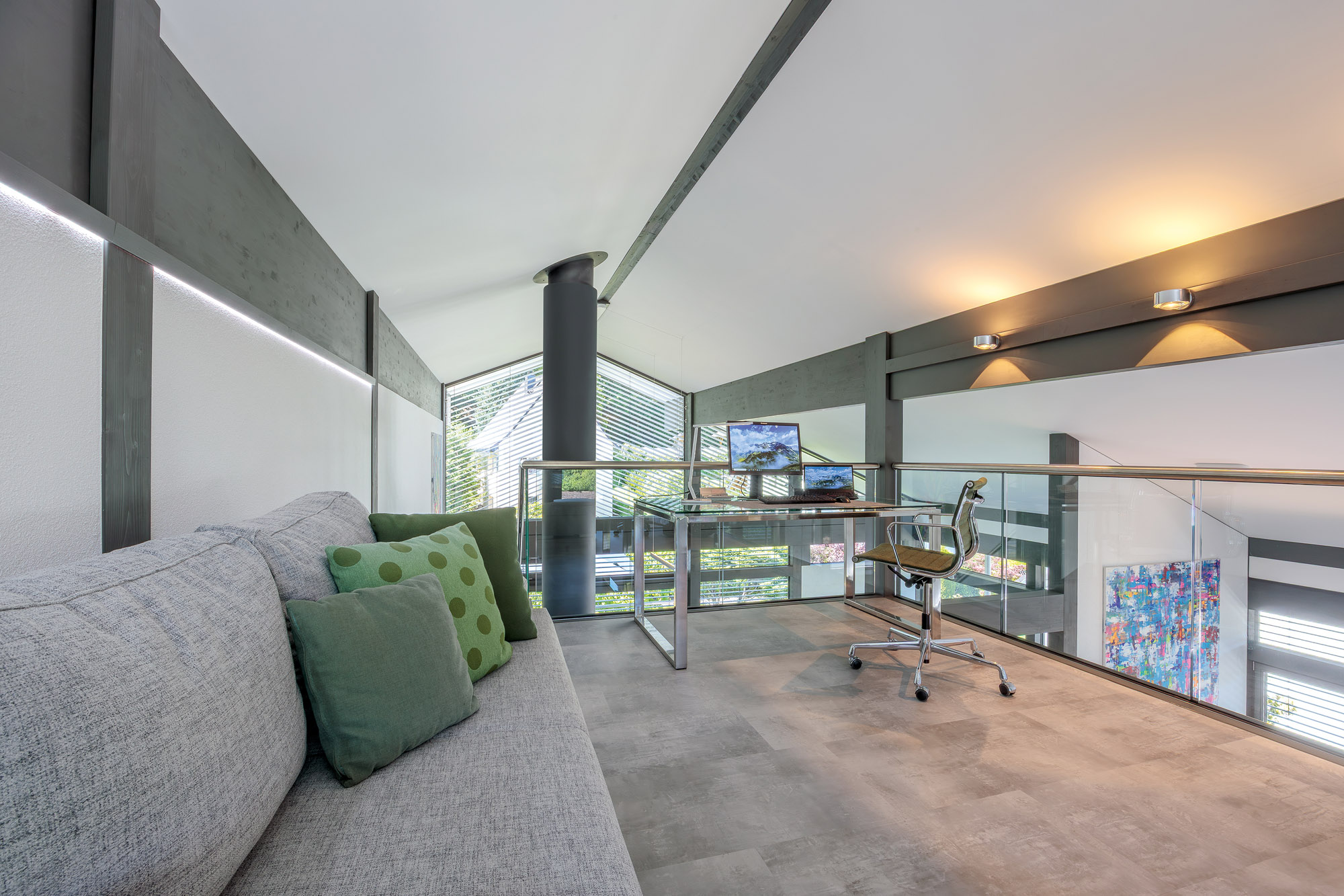 In the mountainous region of Taunus, Germany, a HUF bungalow has been expanded with a generous mezzanine from the ground floor. The additional living space of nearly 15 m² now serves as a bright, contemporary home office that can also be used as a guest room.