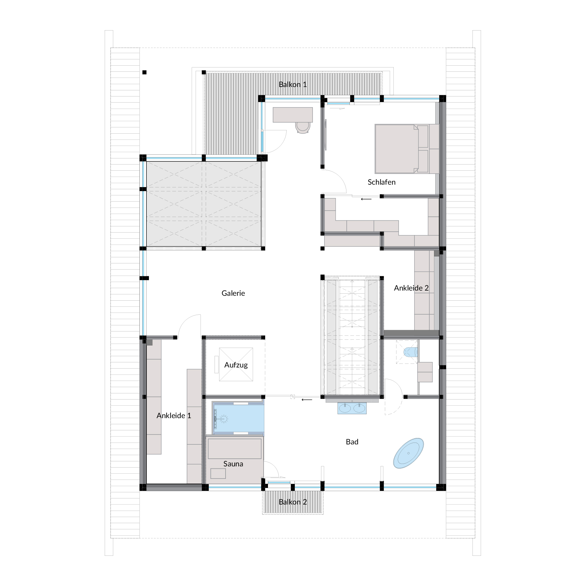 Auf drei Geschossen ist ein Wohnraum entstanden, der perfekt für den neuen Lebensabschnitt der Privatiers geeignet ist, die viel Wert auf fliessende Übergänge und natürliches Tageslicht legen. „Nach 45 Jahren Ehe und Zusammenleben ist man sich einig: Wir wissen genau, was in dieser Phase für uns wichtig ist – und genauso haben wir das Haus geplant. Grosse Entscheidungen wie der Aufzug, die beiden Dachverglasungen oder die grosszügigen Balkone, aber auch kleinere Entscheidungen wie der Wäscheabwurf oder Warmwasser im Außenbereich – solche Details kann man erst umsetzen, wenn man mehrfach gebaut und Erfahrung gesammelt hat“, berichtet der Bauherr.