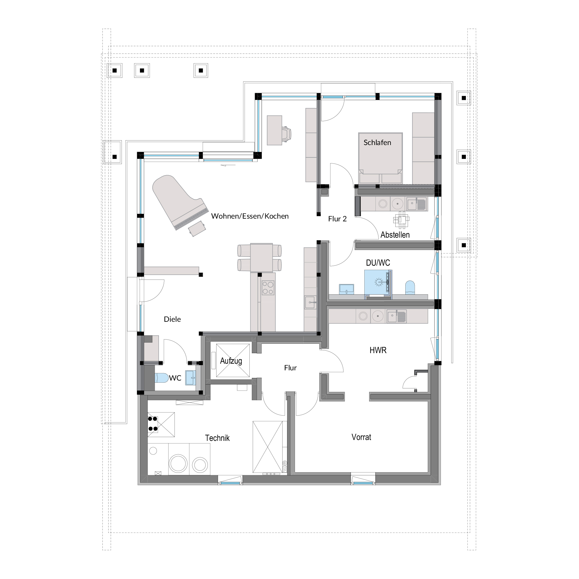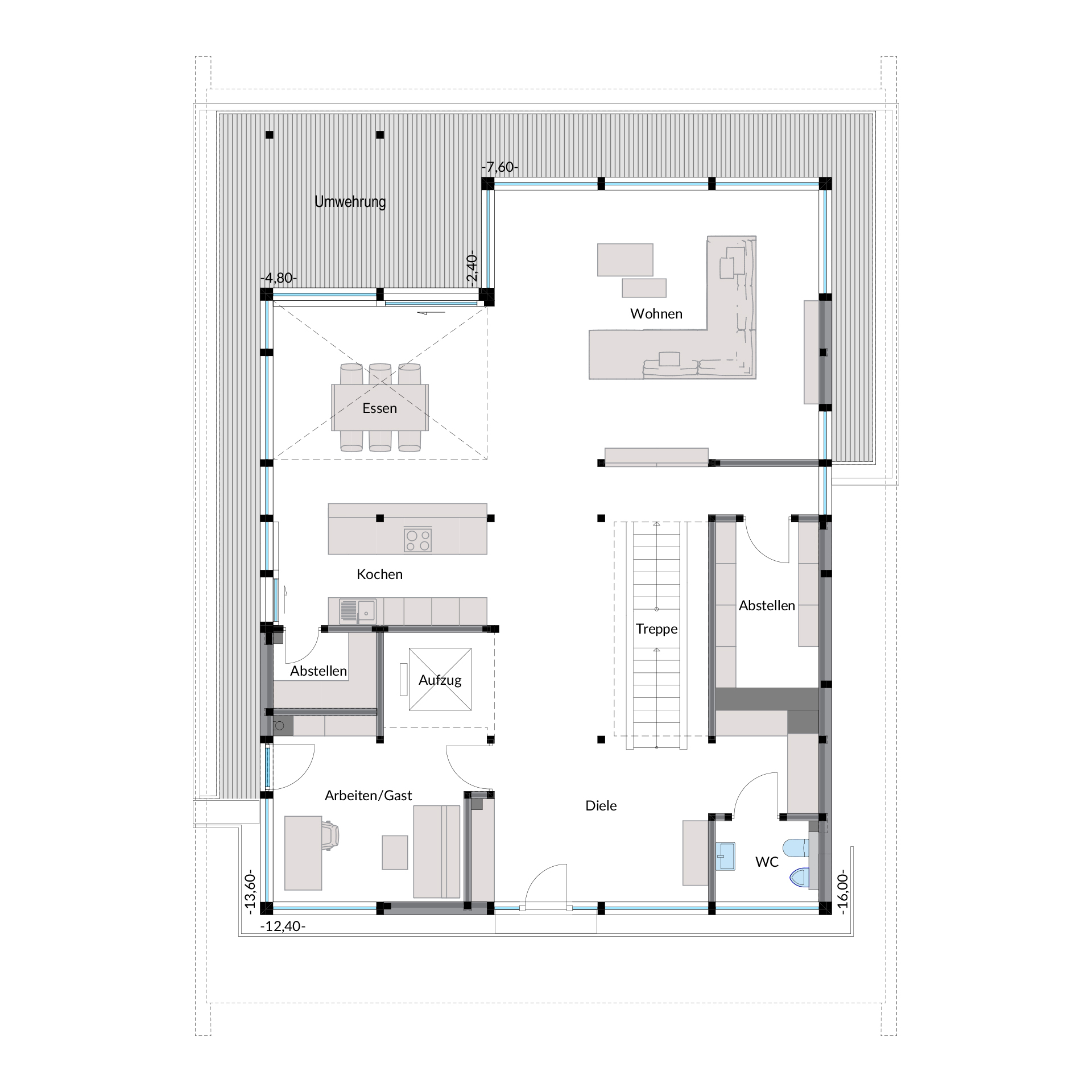 Ob mit der Einliegerwohnung im Untergeschoss für Familienmitglieder oder Pflegekräfte, einem integrierten Aufzug, barrierefreien Zugängen oder intelligenten Smart-Home-Funktionen für mehr Komfort im Alltag: Das Haus verbindet architektonische Leichtigkeit mit vorausschauender Planung.