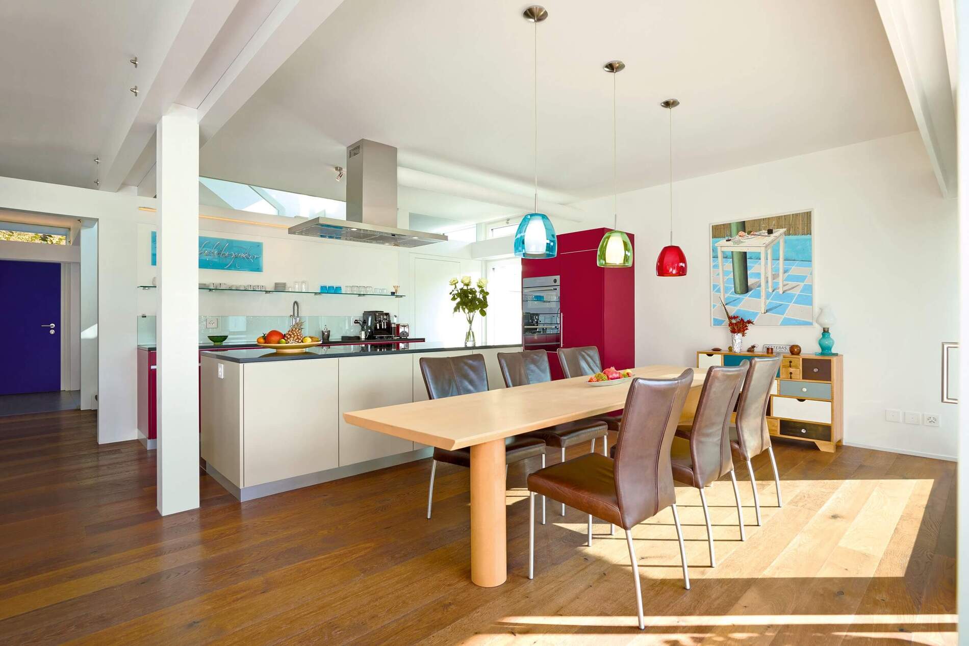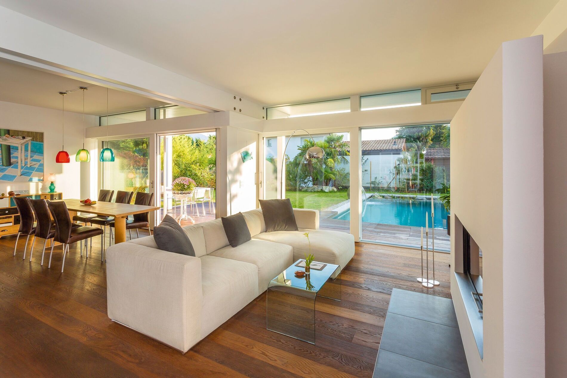 Direkt anschließend an und auf gleicher Ebene wie der Garten entfaltet sich im Erdgeschoss der großzügige, offene Wohn- und Essbereich.