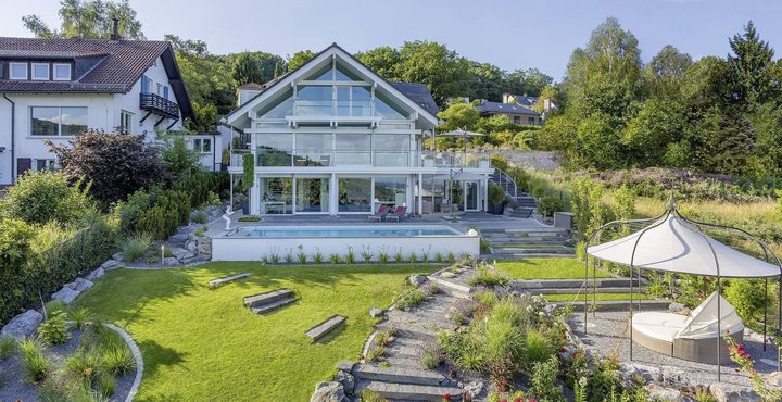 Wichtigste und zugleich einfachste Massnahme für eine angenehme Raumtemperatur ist konstruktiver Sonnenschutz. Das Prinzip: Durch Verschattung an den richtigen Stellen wird die direkte Sonnenstrahlung in das Haus verringert, die Räume heizen sich weniger stark auf. Für Schatten können weite Dachüberstände sorgen, bei Flachdächern oder den beliebten Pultdächern auch ein elegantes Vordach.
