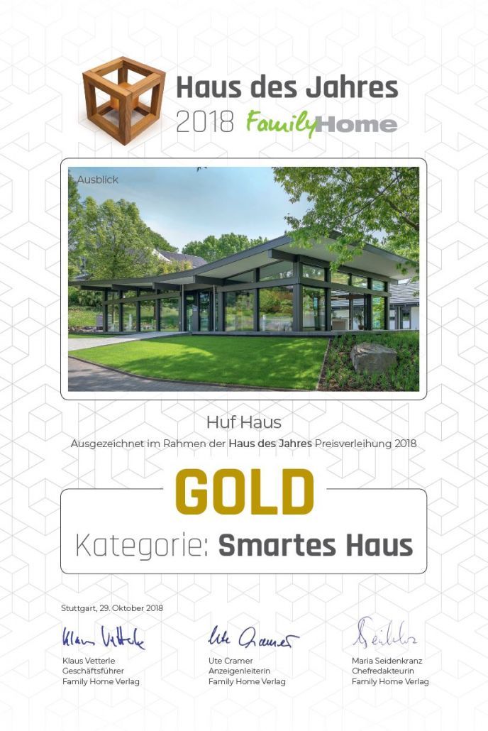 Gold für HUF HAUS – Musterhaus Ausblick wird zum FamilyHome Haus-des-Jahres 2018 in der Kategorie „Smartes Haus“ gekürt und erhält die höchste Auszeichnung in GOLD.