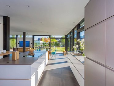 In the open living area, which includes the kitchen, the dining room and the living room, the floor-depth glazing gives the rooms an unusually deep appearance.