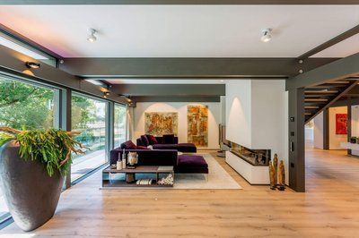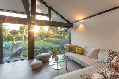 Depending on the style of the interior decorating, you can create a pleasing colour contrast to the flooring with the help of an area rug, sofa cushions or accessories. Vaulted ceilings make the living room look particularly spacious, and expansive wall elements can hold grand, oversized paintings or large-screen televisions.