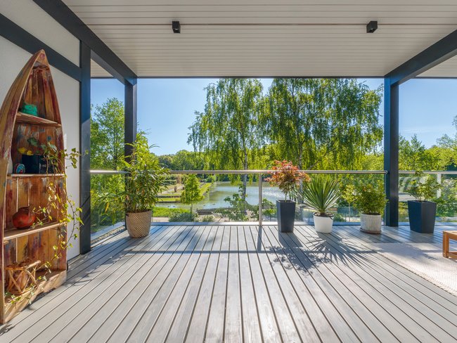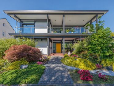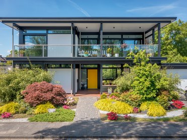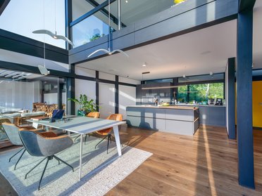Een ander hoogtepunt is het circa 30 m² grote balkon aan de oostzijde. Vanaf hier kijk je uit over het voormalige terrein van de Landesgartenschau, met zijn groene parken en vijvers. “Als yogadocente is dit ruime balkon met uitzicht de ideale plek om actief te bewegen – of om innerlijke rust te vinden,” zegt de bouwvrouw, die een eigen yogastudio runt en een opleiding in Feng Shui heeft gevolgd. Ook het ontbijt in de ochtendzon is een vast ritueel voor het gezin. “Flexibel gebruik was voor ons heel belangrijk – in het uiterste geval moet je hier zelfs kunnen dansen.”