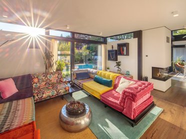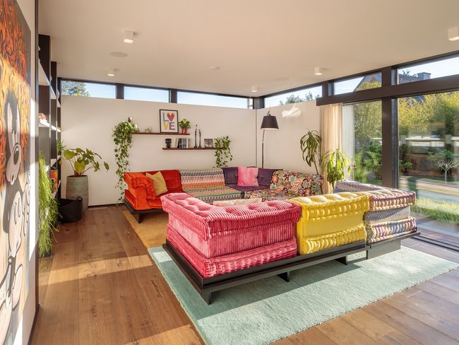 De inrichting – vooral in de woonkamer – is kleurrijk en energiegevend. De ruimtes zijn royaal en licht, maar nooit te groot of kil. De echte houten parketvloer op de begane grond zorgt voor warmte en wordt door het stel gezien als het ‘grootste meubelstuk’ van het huis.